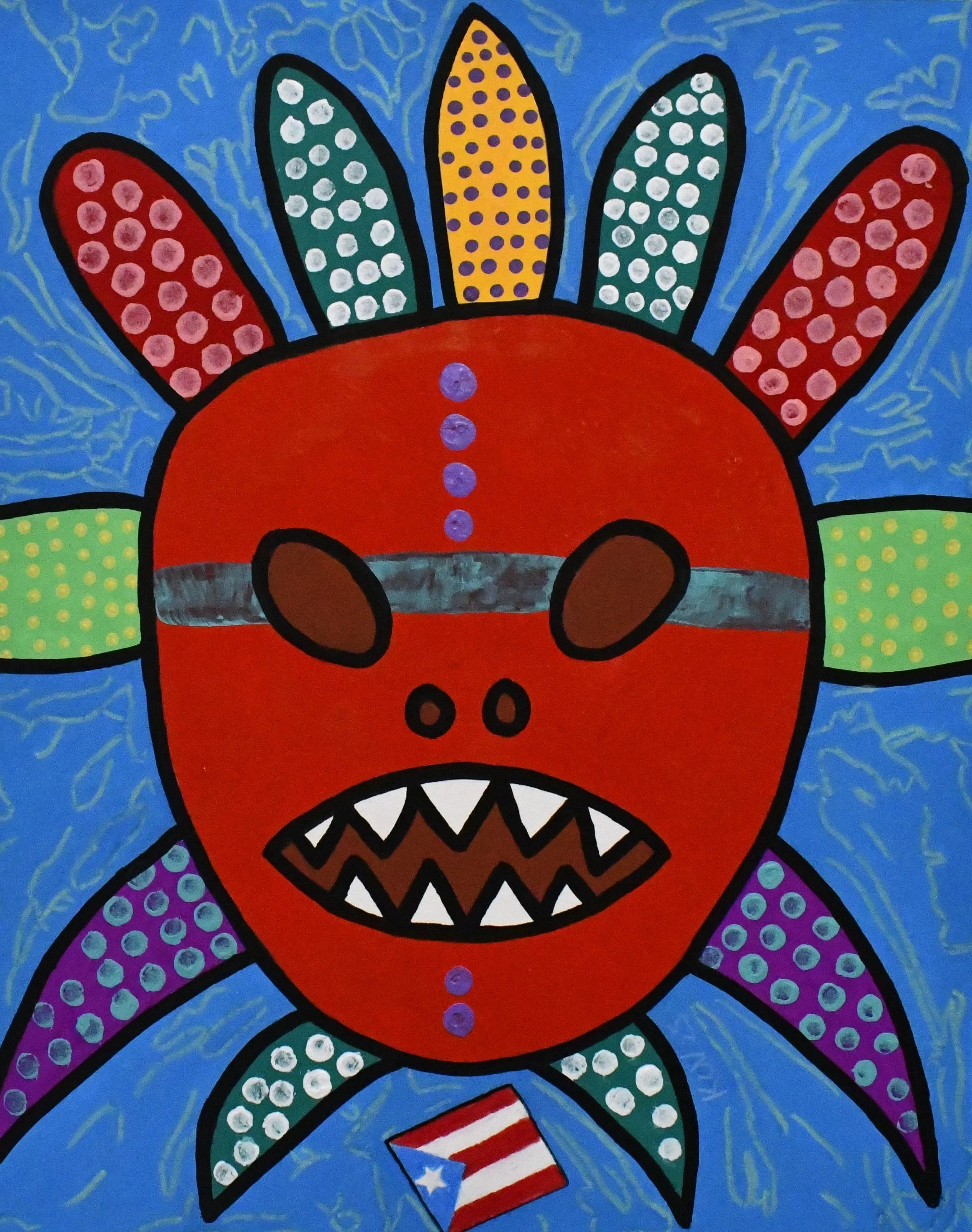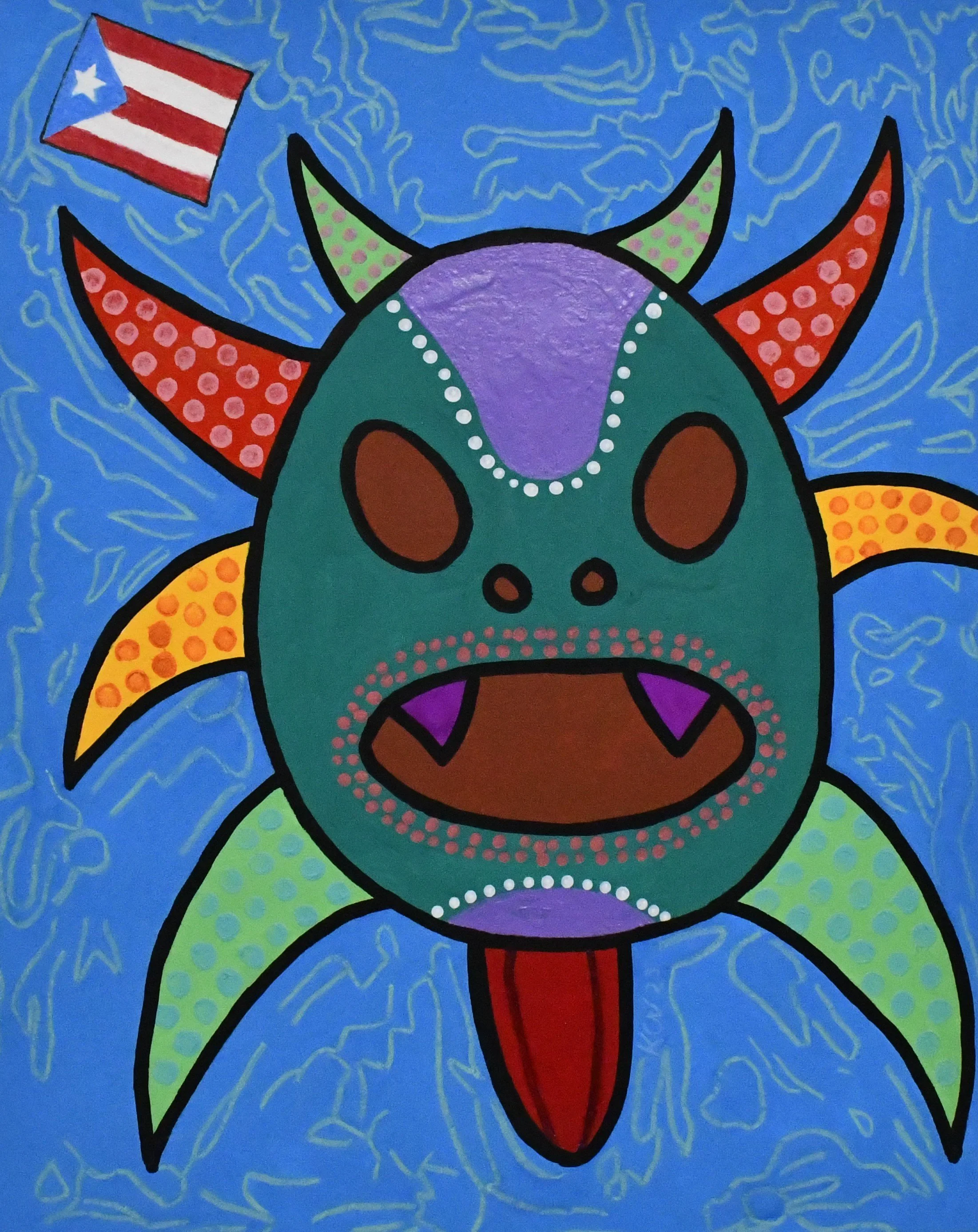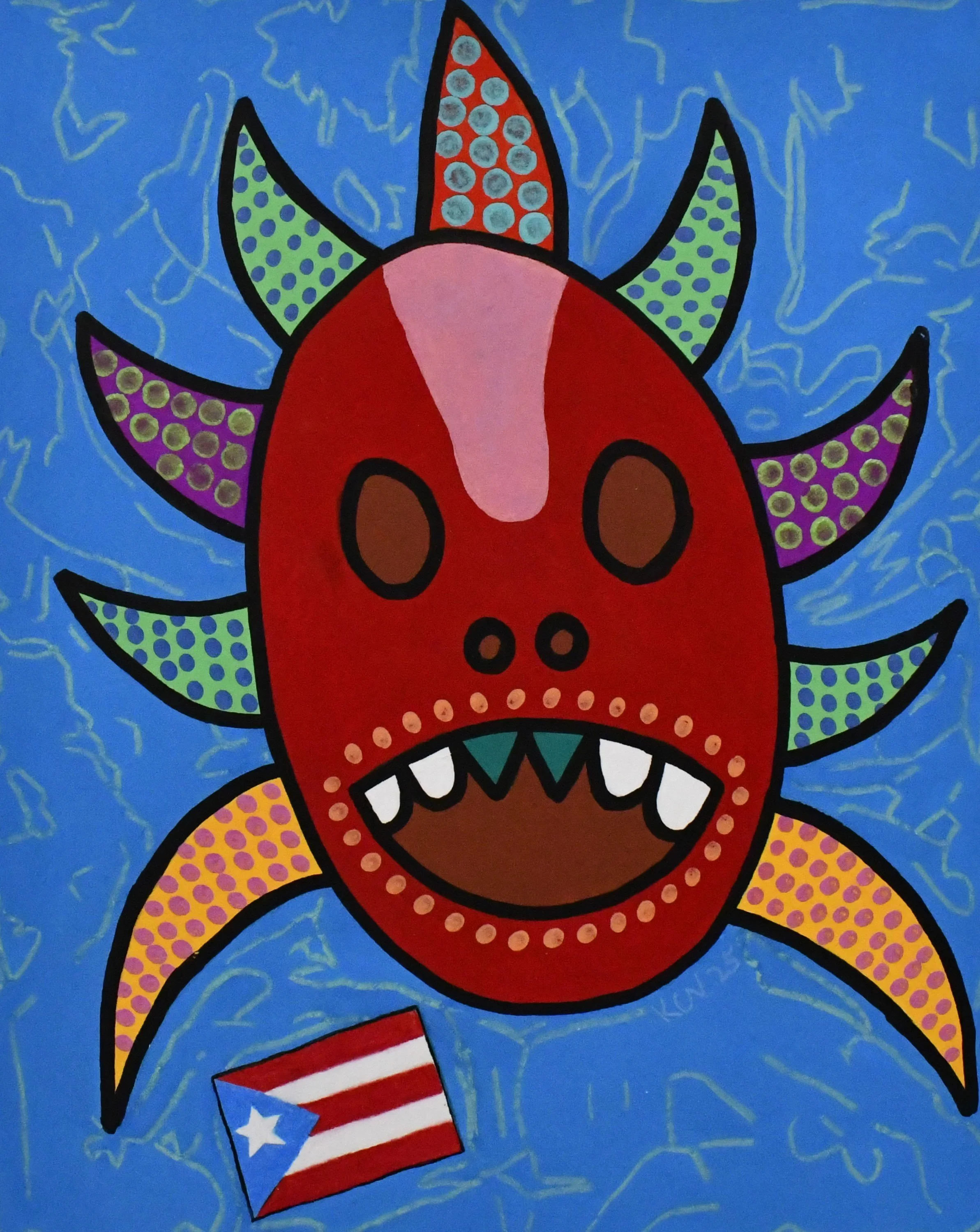 This vibrant collection of six paintings brings the Vejigante to life through a bold fusion of pop art, comic book aesthetics, and traditional Puerto Rican folklore. Each piece captures the spirit of these legendary masked figures with explosive colors, dynamic patterns, and expressive designs. Using gouache and acrylic paint, the artworks showcase intricate dot textures, thick black outlines, and exaggerated facial expressions, evoking both festivity and mystery. The recurring presence of the Puerto Rican flag ties the collection to its cultural roots, reinforcing the Vejigante’s significance in the island’s Carnival traditions.